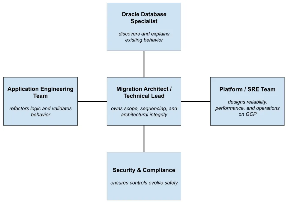 At the center is usually a technical migration lead or architect. This person owns the end-to-end shape of the migration: target architecture, sequencing, trade-offs, and non-goals. They are not simply a database expert; they must understand application behavior, cloud primitives, and organizational constraints well enough to say “no” when a migration approach is heading toward Oracle reimplementation.